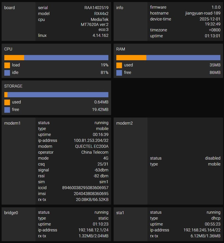 The web interface and CLI are fully synchronized, sharing the same logic and command structure. Unified CLI commands come with context-sensitive hints, reducing errors and eliminating the need for deep Linux knowledge. Any change made in the web UI is instantly reflected in the console, and vice versa, ensuring configuration integrity. Key router parameters (CPU load, memory usage, interface status) are displayed in real time on the main dashboard. Modified but unapplied settings are visually highlighted, providing complete control and faster troubleshooting.
